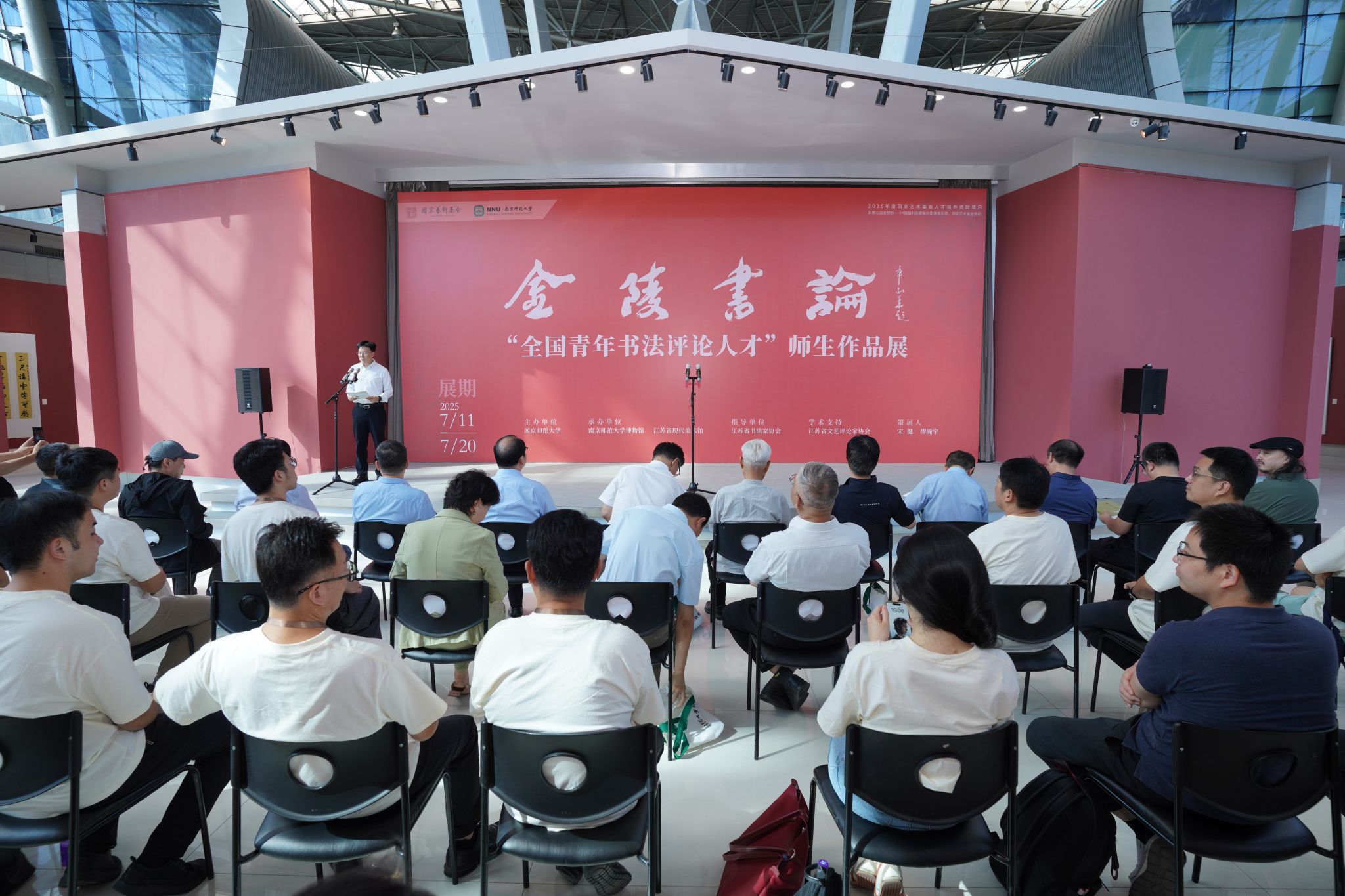 7月14日下午,由国家艺术基金资助、南京师范大学主办的“金陵书论”全国青年书法评论人才师生作品展在江苏省现代美术馆开幕。本次展览集中展示了项目师生精心创作的书法作品百余件,展现了当代青年书法评论人才的艺术风采与学术成果。原南京军区政委、上将方祖岐,江苏省政协原主席蒋定之,江苏省文联主席章剑华,江苏省纪委监委一级巡视员蒋云峰,江苏省文化和旅游厅副厅长钱钢,吉林省书协第六届副主席、吉林大学教授张金梁,山东省书协顾问、山东大学教授郑训佐,湖北省书协主席、湖北美术学院教授孟庆星,江苏省...
