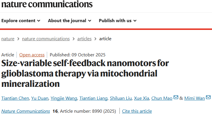 2021年,上海交通大学与《科学》共同出版了专刊《125个科学问题:探索与发现》,其中之一:“可注射的治疗纳米机器人会成为现实吗?”我校化科院毛春教授/万密密教授团队长期致力于纳米机器人创新药物研发,最近该团队在此方向发表系列重要研究成果,为上述科学问题的解决提供了重要的理论研究基础。(一)以“Size-variable self-feedback nanomotors for glioblastoma therapy via mitochondrial mineralization”为题发表在学术领域公认的著名权威综合性期刊Nature ...